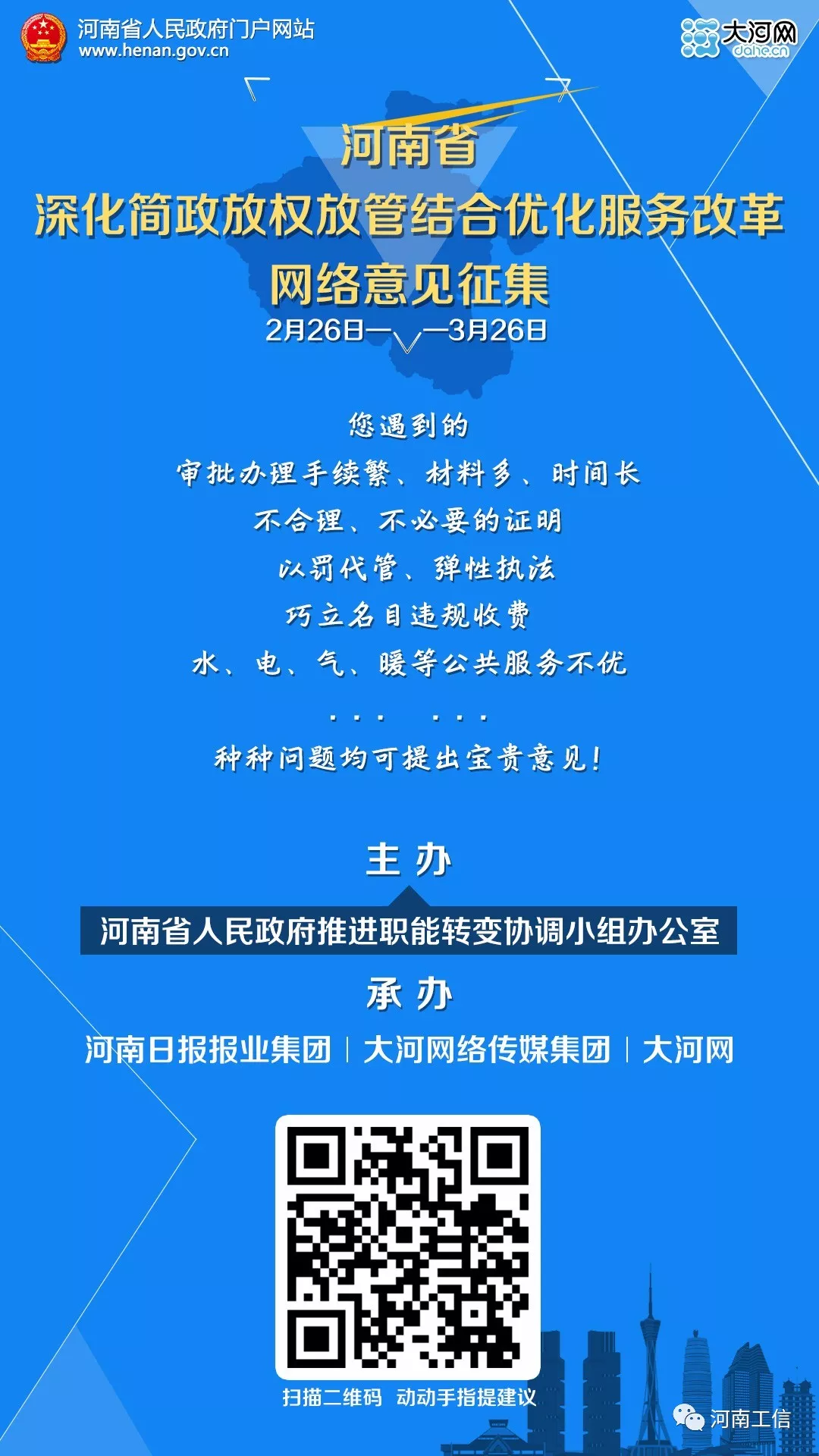 “河南省深化简政放权放管结合优化服务改革网络意见征集”专栏(https://fgf.dahe.cn/sup/feed)2月26日正式上线,期待您提出宝贵意见建议。