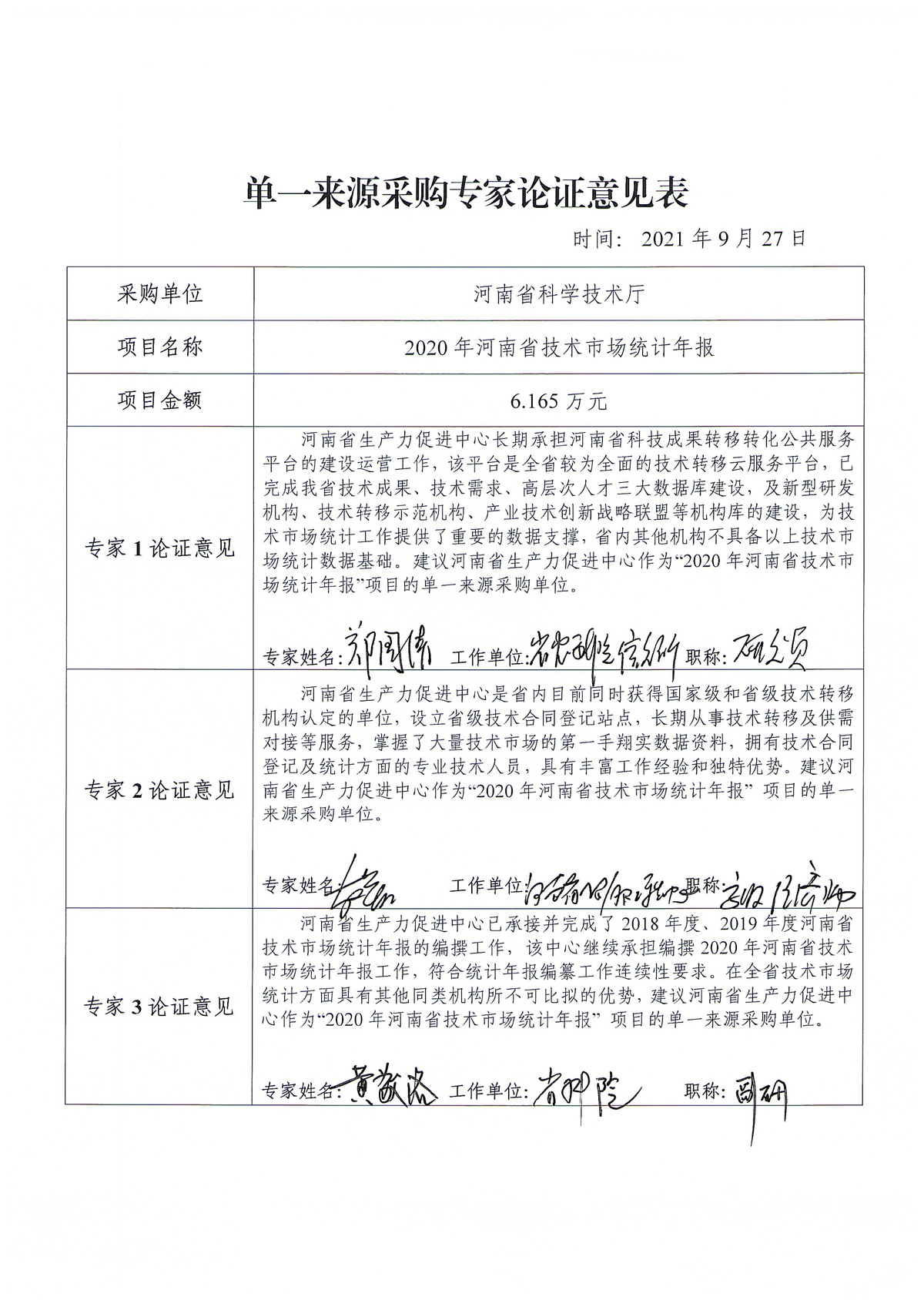 9月27日,省科技厅成果处组织了2020年河南省技术市场统计年报单一来源采购专家论证会,并出具了专家论证意见。经论证,专家组建议采用单一来源采购方式,并将河南省生产力促进中心作为单一来源采购供应商。